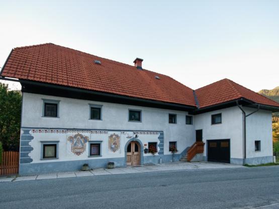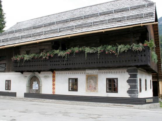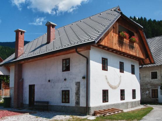 Oglejte si značilno alpsko »streho na čop«, oba zunanja hodnika »ganka«, fresko sv. Florjana na vzhodni in sončno uro na južni fasadi hiše. Nato se sprehodite po hiši s kamro, veži s črno kuhinjo in kaščo.